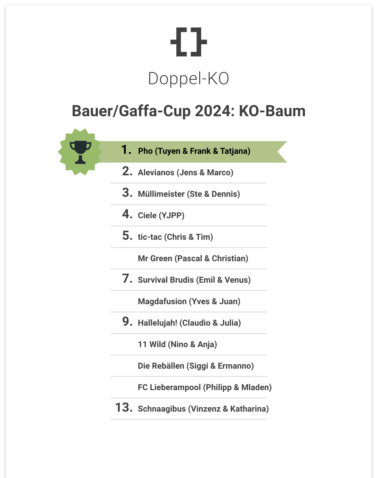 • 1 Pho (Tuyen & Frank & Tatjana)• 2 Alevianos (Jens & Marco)• 3 Müllimeister (Ste & Dennis)• 4 Ciele (YJPP)• 5 tic-tac (Chris & Tim)Mr Green (Pascal & Christian)• 7 Survival Brudis (Emil & Venus)Magdafusion (Yves & Juan)• 9 Hallelujah! (Claudio & Julia)11 Wild (Nino & Anja)Die Rebällen (Siggi & Ermanno)FC Lieberampool (Philipp & Mladen)• 13 Schnaagibus (Vinzenz & Katharina) -